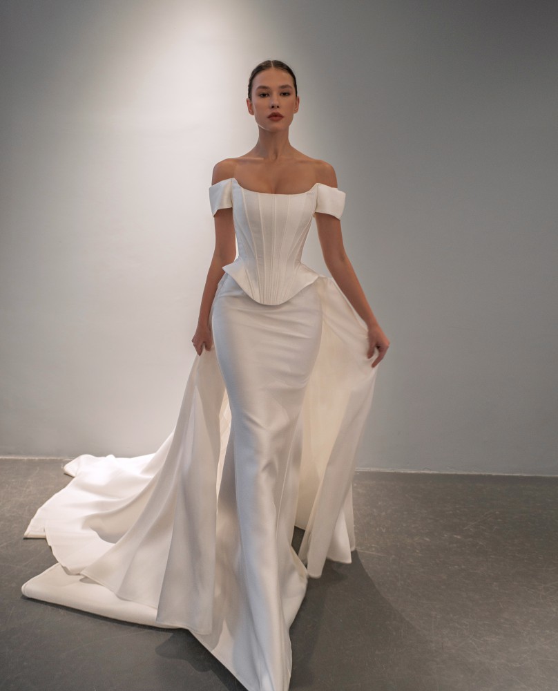 На фото корсет, юбка, съемный шлейф, отшивается в молочном цвете.