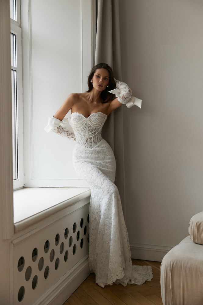 Свадебное платье, А-силуэта, с перчатками и жемчужным обвесом.