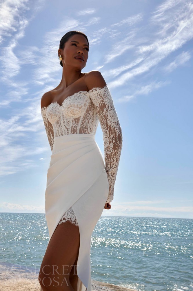 Облегающее свадебное платье-трансформер. Прелестный кружевной мини наряд с открытыми плечами и длинными рукавами дополнен съемной юбкой-русалкой из атласа, имеющей разрез до бедра.