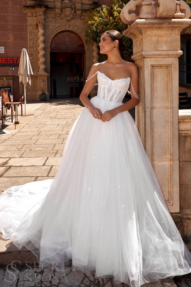 Свадебное платье с открытыми плечами. Корсетный лиф с глубоким декольте, отделан тонкими кружевными узорами. Длинная фатиновая юбка среднего объема со шлейфом.