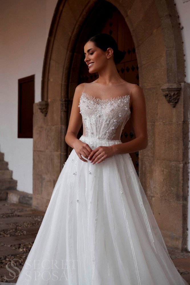 Фатиновое свадебное платье с корсетом. Лиф на прозрачной евросетке, отделан изящной вышивкой из блестящих бусин, напоминающих морозные узоры. Длинная фатиновая юбка среднего объема со шлейфом.