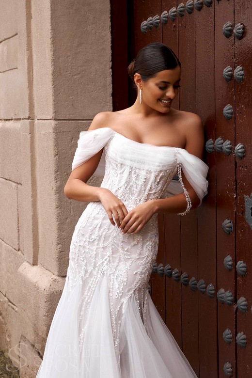 Кружевное подвенечное платье силуэта русалка с открытыми плечами и вставками из фатина на зоне декольте и юбке. Верхняя часть на корсете, с открытыми плечами. Объемная, облегающая бедра юбка с красивым шлейфом.